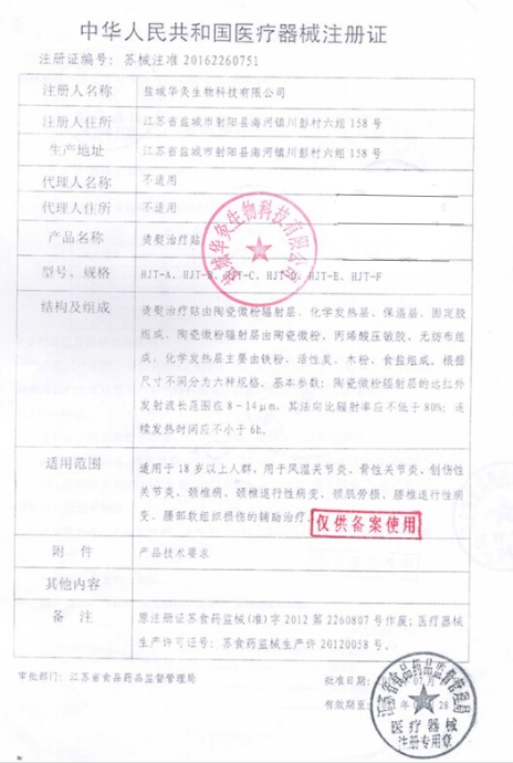 蘇食藥監(jiān)械(準(zhǔn))字2012第2260807號/鹽城華灸生物科技有限公司 有效期至:2016-10-31燙熨治療貼