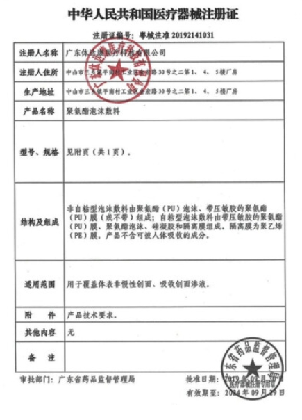 豫械注準20222140804/河南駝人貝斯特醫(yī)療器械有限公司 有效期至:2027-05-19聚氨酯泡沫敷料