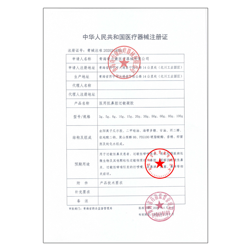 晉械注準20252140130/星禾藥業(yè)(山西)集團有限公司 有效期至:2030-07-22醫(yī)用抗鼻腔過敏凝膠