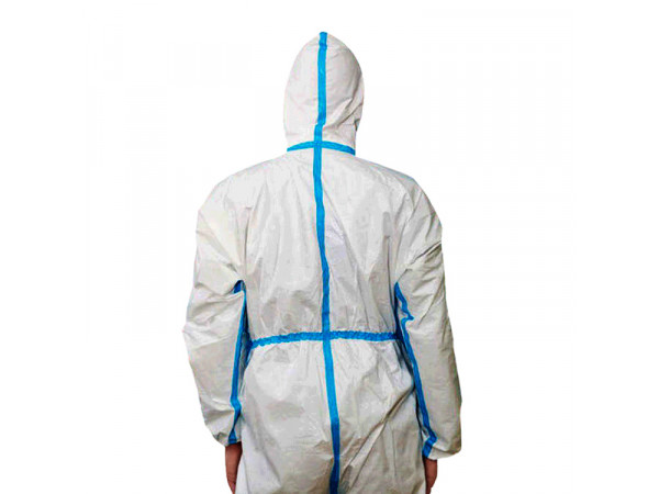 醫(yī)用防護(hù)服由連帽上衣、褲子組成,防護(hù)服由PP紡粘法非織造布或PET水刺法非織造布和PE膜復(fù)合而成,袖口、腳踝口為彈性收口,帽子面部收口及腰部收口可采用彈性收口、拉繩收口或搭扣的方式。