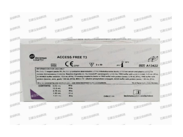 試劑1(R1a):包被著鏈霉親和素的順磁性微粒溶于三羥甲基氨基甲烷(TRIS)緩沖液中[ 含有蛋白質(zhì)( 鳥類)、表面活性劑、NaN3、以及ProClin 300] 。試劑2(R1b):2-(N-嗎啉代)乙磺酸(MES) 緩沖液以及ProClin 300 。試劑3(R1c):生物素化T3 相似物溶于三羥甲基氨基甲烷(TRIS)緩沖液中[ 含有蛋白質(zhì)( 鳥類)、表面活性劑、NaN3 以及ProClin 300] 。試劑4(R1d):三羥甲基氨基甲烷(TRIS)緩沖液中[ 含動物蛋白( 山羊、牛、鳥類)、表面活性劑、NaN3 以及ProClin 300] 。試劑5(R1e):單克隆抗體-堿性磷酸酶結(jié)合物溶于N-(2-乙酰胺)-2-氨基乙磺酸(ACES) 緩沖液[ 含蛋白質(zhì)( 鳥類)、表面活性劑、NaN3 以及ProClin 300] 。(具體內(nèi)容詳見說明書)