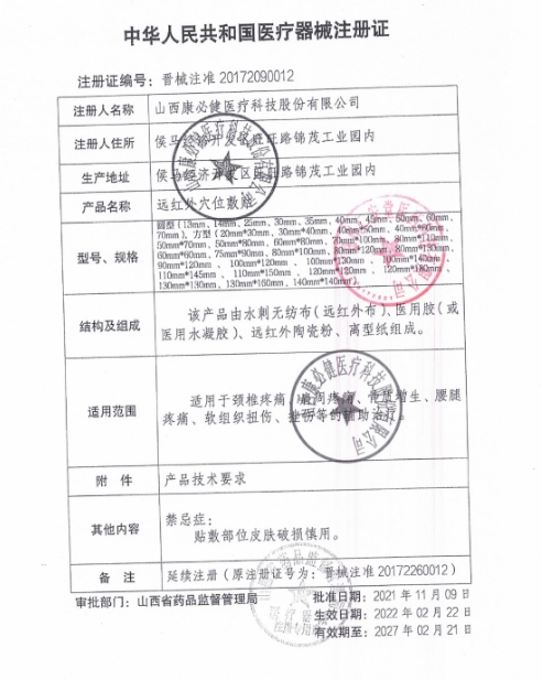 晉械注準20172260012/侯馬經濟開發(fā)區(qū)金葵花大健康產業(yè)有限公司貼 有效期至:2022-02-21遠紅外穴位敷貼