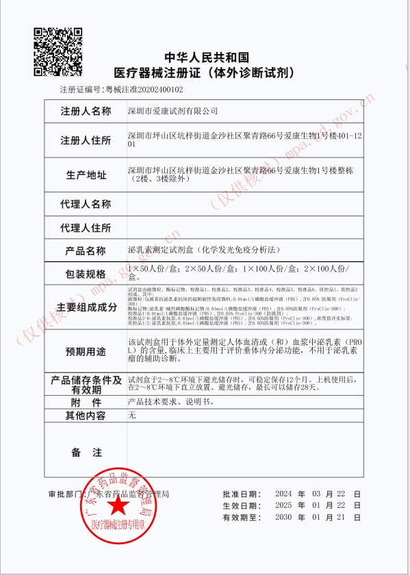 粵械注準(zhǔn)20202401573/深圳天深醫(yī)療器械有限公司 有效期至:2025-09-28泌乳素測定試劑盒(化學(xué)發(fā)光免疫分析法)