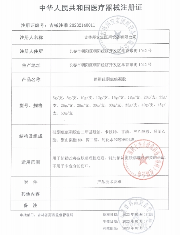 吉械注準(zhǔn)20232140384/吉林省邦孚醫(yī)療器械有限公司 有效期至:2028-06-05醫(yī)用硅酮疤痕凝膠