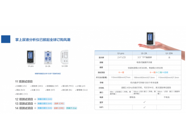 產(chǎn)品適用于對配套的尿液分析試紙條進(jìn)行分析,供醫(yī)療機(jī)構(gòu)對人體尿液樣本中生化成分進(jìn)行半定量檢測,為臨床檢驗(yàn)和診斷提供參考??蓹z測項(xiàng)目有:尿膽原、膽紅素、酮體、潛血、蛋白質(zhì)、亞硝酸鹽、白細(xì)胞、葡萄糖、比重、酸堿度、維生素C、微量白蛋白、肌酐和鈣離子。