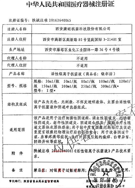該產(chǎn)品為無(wú)色、無(wú)刺激、不揮發(fā)透明液體。主要由活性銀離子抗菌液和陰道沖洗器組成。
