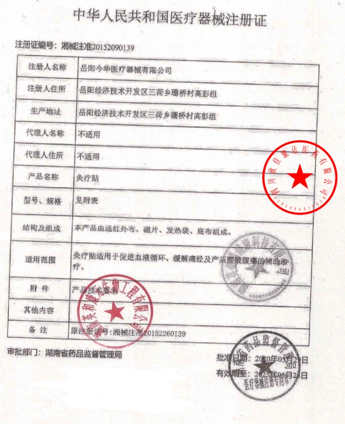 湘械注準(zhǔn)20152260139/岳陽(yáng)今華醫(yī)療器械有限公司 有效期至:2020-09-20灸療貼