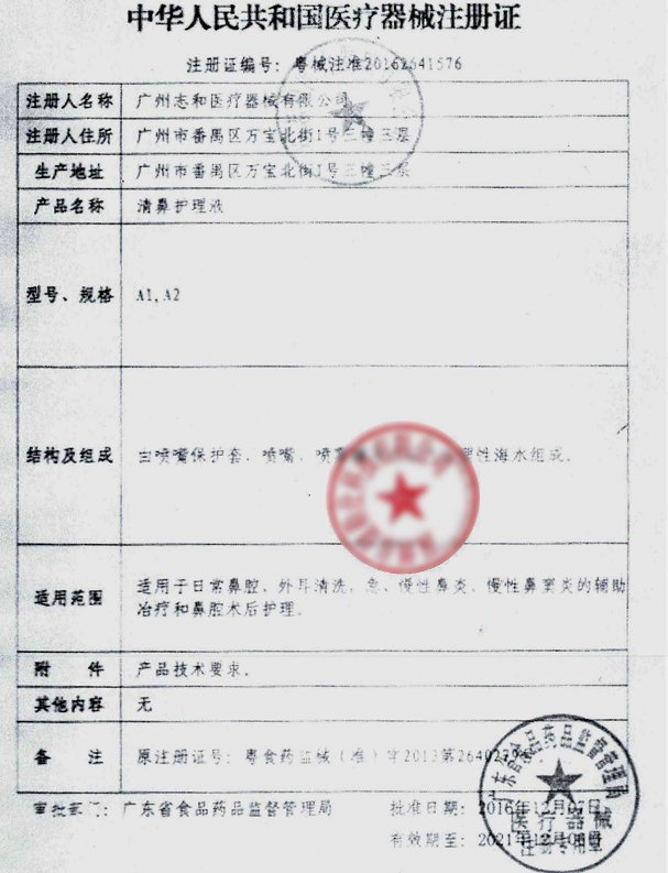 粵械注準20162141576/廣州志和醫(yī)療器械有限責任公司 有效期至:2026-07-15清鼻護理液