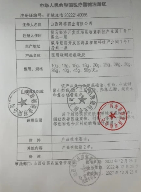 晉械注準(zhǔn)20242140007/山西康必健醫(yī)藥集團(tuán)有限公司 有效期至:2029-01-25醫(yī)用硅酮疤痕凝膠