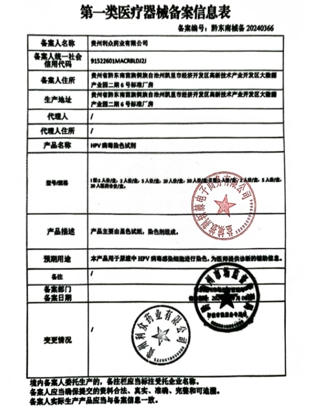 黔東南械備20230134/貴州利眾藥業(yè)有限公司HPV病毒染色試劑