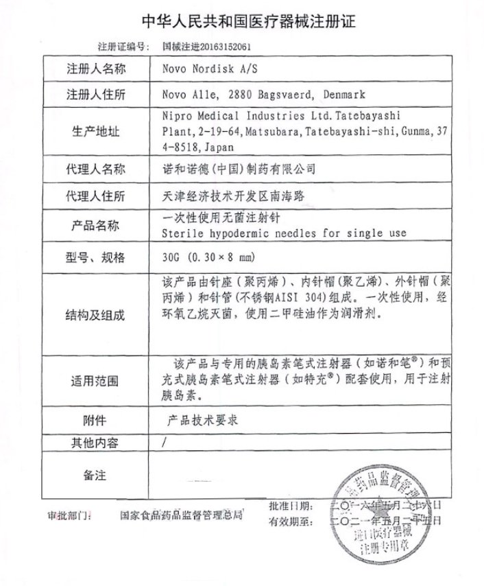 國(guó)食藥監(jiān)械(進(jìn))字2014第3154569號(hào)/NanoPass Technologies Ltd. 有效期至:2018-09-29一次性使用無菌注射針