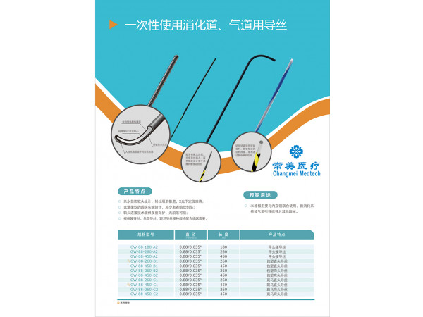 一次性使用泌尿道用導絲分泥鰍型導絲、包塑型導絲和斑馬型導絲三種。泥鰍型導絲由芯絲(NiTi)和包塑涂層(PU、鎢、親水涂層)組成;包塑型導絲由繞絲(06Cr19Ni10)、芯絲(NiTi)和包塑涂層(聚四氟乙烯)組成;斑馬型導絲由軟頭(PU、鎢、親水涂層)、芯絲(NiTi)和包塑涂層(聚四氟乙烯)組成。按產(chǎn)品頭部特征分為泥鰍直頭導絲、泥鰍彎頭導絲、包塑直頭導絲、包塑彎頭導絲、斑馬直頭導絲、斑馬彎頭導絲,每種按尺寸不同分為若干規(guī)格。導絲最大直徑:0.63-0.88mm,工作長度:30-150cm。產(chǎn)品經(jīng)環(huán)氧
