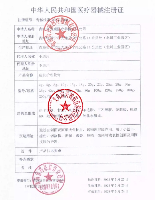 注冊證編號:黑械注準20242140026/大慶華泰生物制藥有限公司 有效期至:2029-03-25皮膚護理軟膏