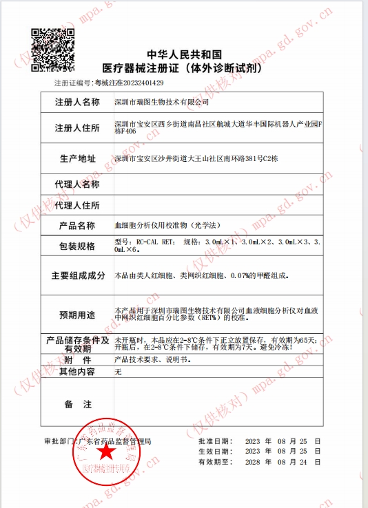 本產(chǎn)品用于深圳市瑞圖生物技術(shù)有限公司血液細(xì)胞分析儀對血液中網(wǎng)織紅細(xì)胞百分比參數(shù)(RET%)的校準(zhǔn)。