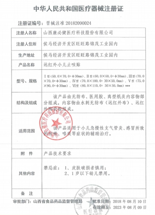 2024年12月陜西醫(yī)用耗材產(chǎn)品目錄動(dòng)態(tài)調(diào)整掛網(wǎng)結(jié)果 遠(yuǎn)紅外小兒止咳貼 晉械注準(zhǔn)20182090024 7.00