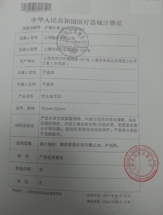 滬食藥監(jiān)械(準(zhǔn))字2010第1641305號/上海強(qiáng)生有限公司 有效期至:2014-11-23防水創(chuàng)可貼