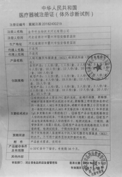 冀械注準20202400167/金華科生物技術河北有限公司 有效期至:2030-04-12人絨毛膜促性腺激素(HCG)檢測試劑盒(膠體金免疫層析法)
