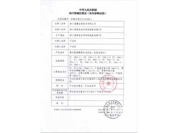 浙食藥監(jiān)械(準(zhǔn))字2012第2400015號/浙江福康生物技術(shù)有限公司 有效期至:2016-01-11腺苷脫氨酶測定試劑盒(連續(xù)監(jiān)測法)