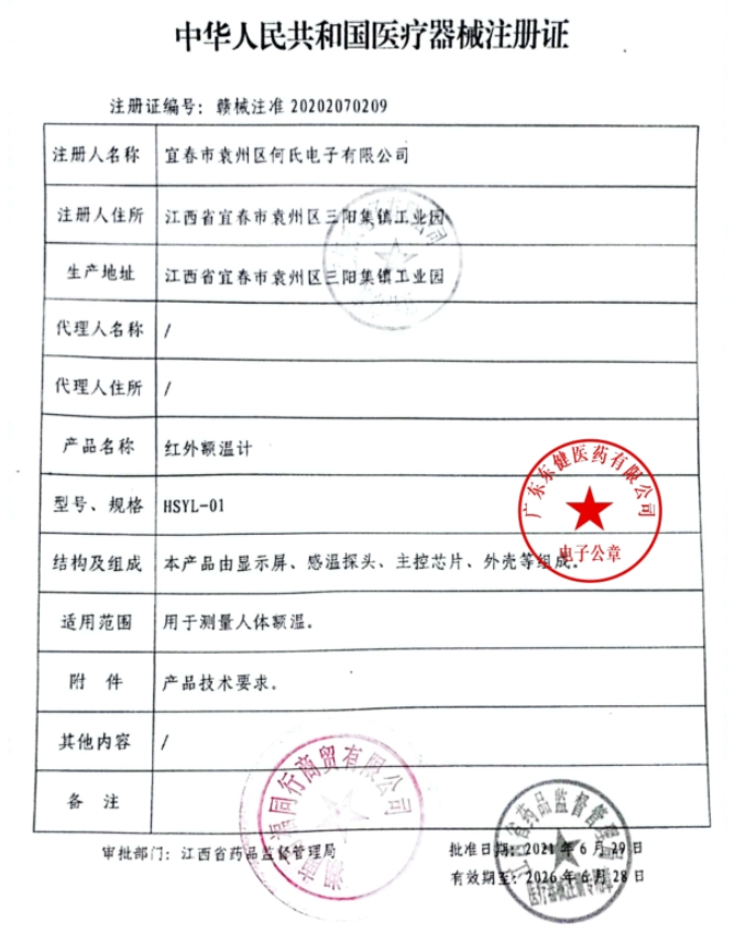 贛械注準(zhǔn)20202070224/江西省邁樂醫(yī)療器械有限公司 有效期至:2026-05-07紅外額溫計