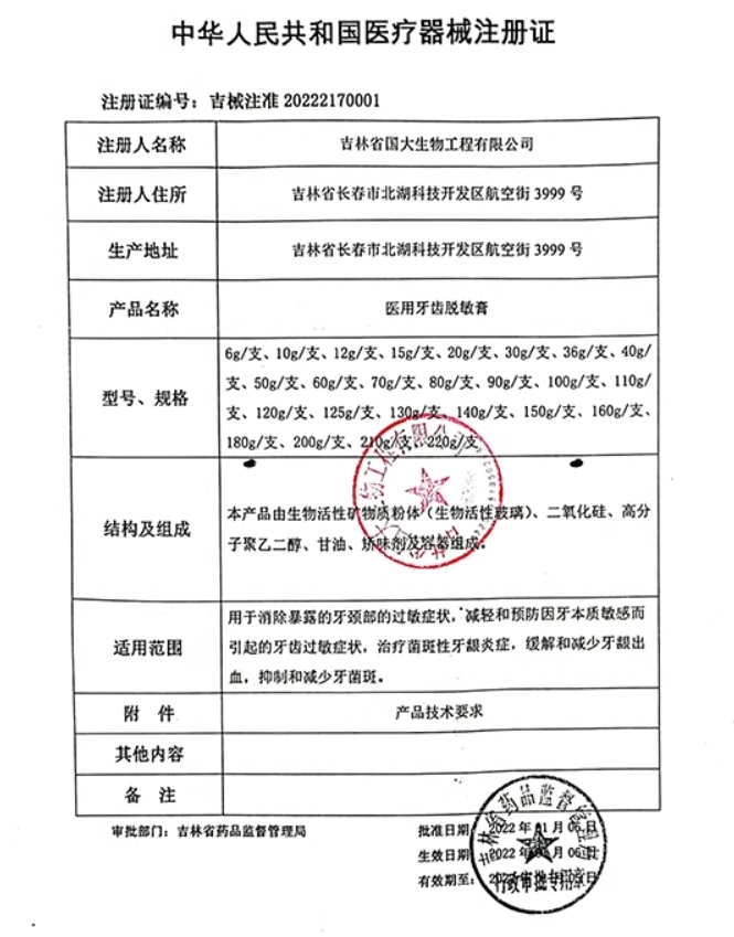 吉械注準(zhǔn)20242170304/吉林省博仕佳醫(yī)藥有限公司 有效期至:2029-06-26醫(yī)用牙齒脫敏膏