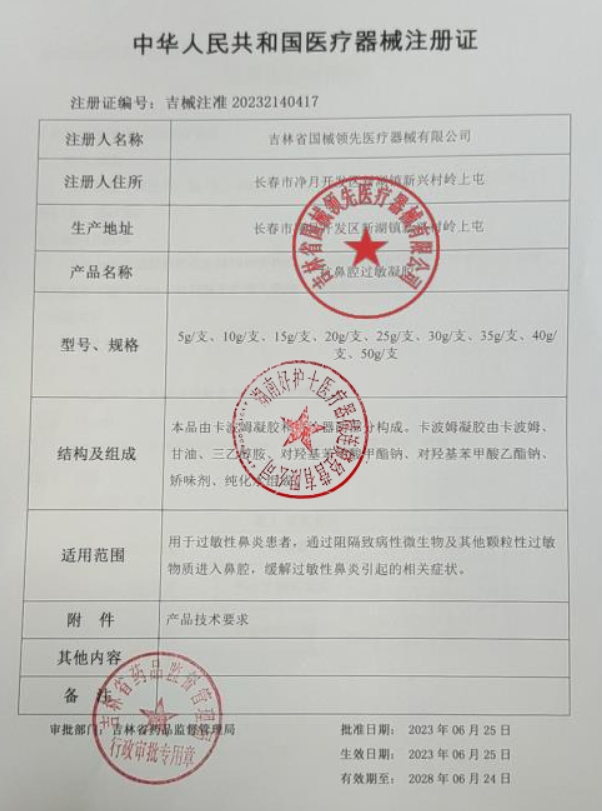 吉械注準(zhǔn)20232140435/吉林省奧德醫(yī)療器械有限公司 有效期至:2028-07-13抗鼻腔過(guò)敏凝膠