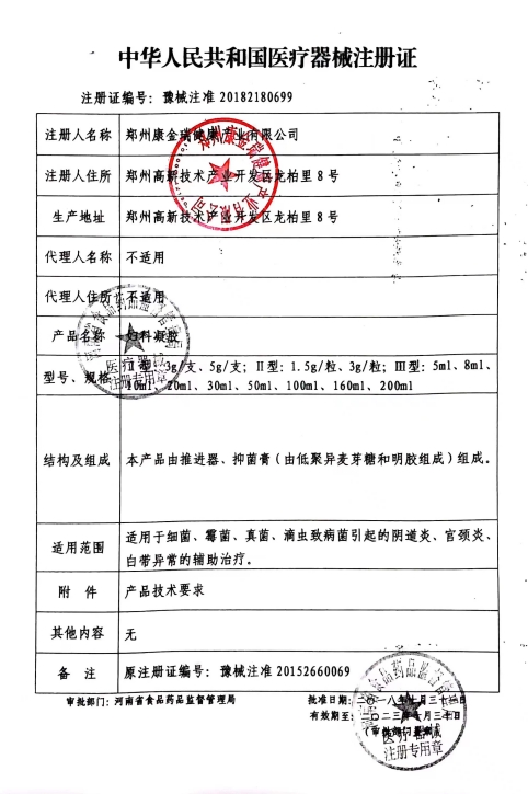晉械注準(zhǔn)20242180120/山西康必健醫(yī)藥集團(tuán)有限公司 有效期至:2029-07-11婦科凝膠