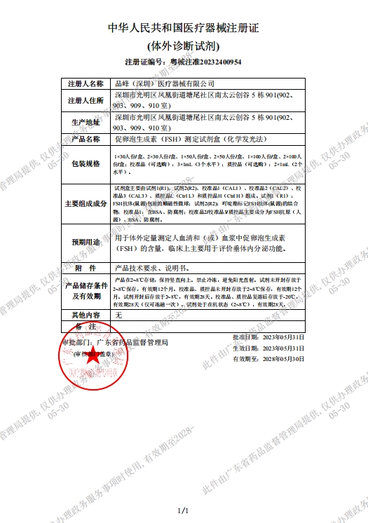 湖南醫(yī)用耗材擬掛產(chǎn)品公示(第五十九批) 促卵泡生成素(FSH)測(cè)定試劑盒(化學(xué)發(fā)光法) 粵械注準(zhǔn)20232400954 2×50人份/盒;校準(zhǔn)品(可選購(gòu)):3×1.0 mL(3個(gè)水平); 1900