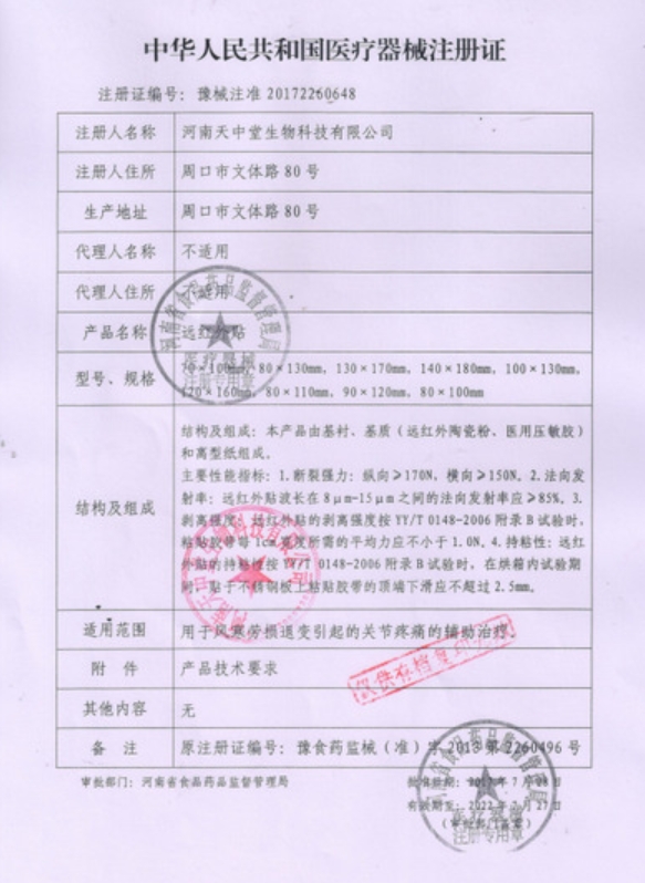 豫食藥監(jiān)械(準)字2013第2260114號/周口上方醫(yī)療器械有限公司 有效期至:2017-03-11遠紅外貼