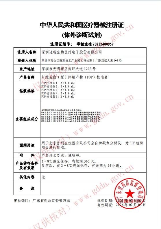 用于北京邁瑞醫(yī)療器械有限公司和深圳邁瑞生物醫(yī)療電子股份有限公司全自動凝血分析儀,對FDP檢測項目進行校準。