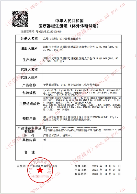 山東省醫(yī)用耗材限價掛網數據 甲狀腺球蛋白(Tg)測定試劑盒(化學發(fā)光法) 粵械注準20232401940 2×50人份/盒、校準品(可選購):3×1.0 mL(3個水平);質控品(可選購):2×1.0 mL(2個水平) 3200.0000
