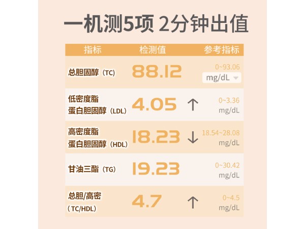 本產(chǎn)品與配套的血脂測(cè)試卡配合使用,用于定量檢測(cè)人體全血(毛細(xì)血管血或靜脈血)、血漿或血清中總膽固醇(CHOL)、高密度脂蛋白膽固醇(HDL)和甘油三酯(TRIG)的含量。