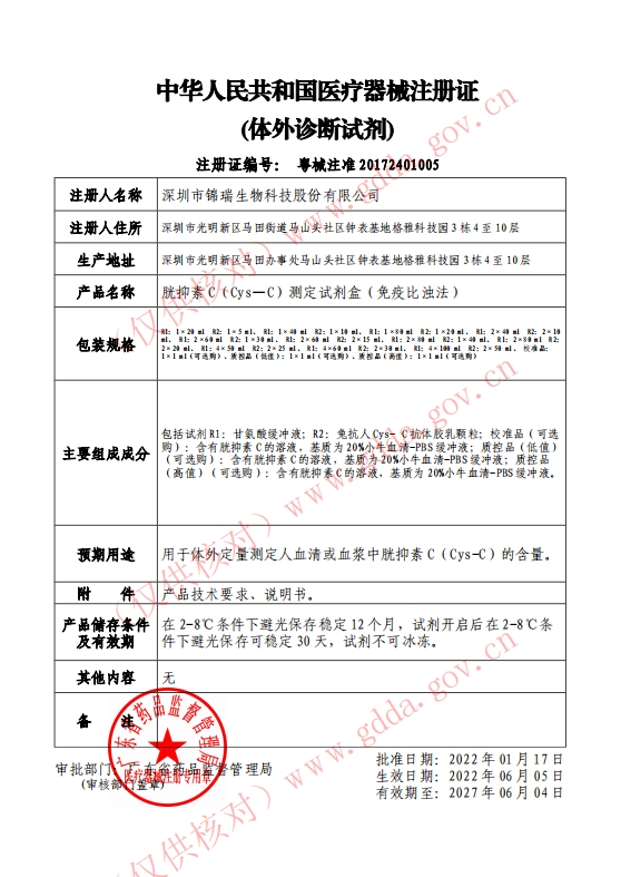 江西省+動態(tài)第40批 胱抑素C(Cys-C)測定試劑盒(免疫比濁法) 粵械注準20172401005 R1:2×40ml;R2:2×10ml 5000.0000