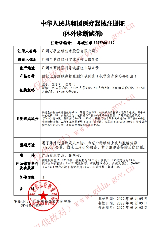 江西省+動(dòng)態(tài)第56批 鱗狀上皮細(xì)胞癌抗原測(cè)定試劑盒(化學(xué)發(fā)光免疫分析法) 粵械注準(zhǔn)20222401112 50人份|盒 5000.0000