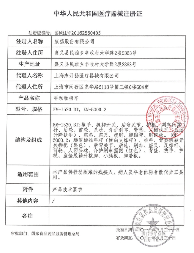 國(guó)械注許20152560122/上海杰開(kāi)揚(yáng)醫(yī)療器械有限公司 有效期至:2019-08-10手動(dòng)輪椅車(chē)