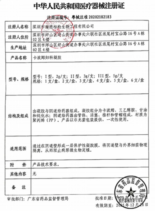 川械注準20232180206/金標醫(yī)療器械(成都)有限公司 有效期至:2028-06-26卡波姆婦科凝膠