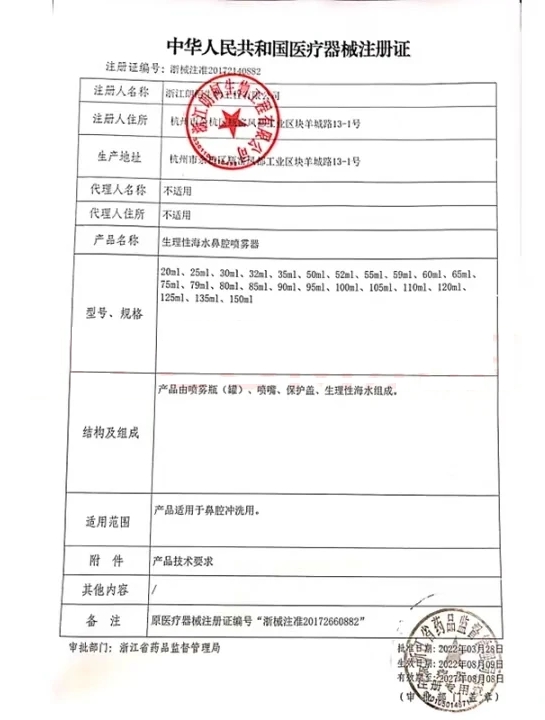 江西省+動(dòng)態(tài)第24批 生理性海水鼻腔噴霧器 浙械注準(zhǔn)20172140882 150ml 187.5000