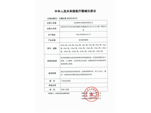 湖南醫(yī)用耗材擬掛產(chǎn)品公示(第三十五批) 醫(yī)用液體敷料 吉械注準(zhǔn)20222140172 50mL/瓶 95