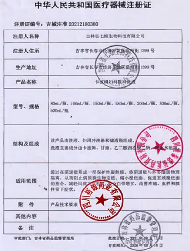 吉械注準(zhǔn)20222180072/吉林省達(dá)達(dá)醫(yī)藥生物有限公司 有效期至:2027-02-09卡波姆婦科液體敷料