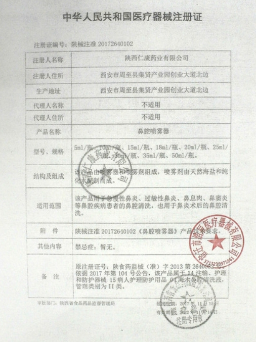 陜食藥監(jiān)械(準(zhǔn))字2013第2640082號/陜西仁康藥業(yè)有限公司 有效期至:2017-11-05鼻腔噴霧器