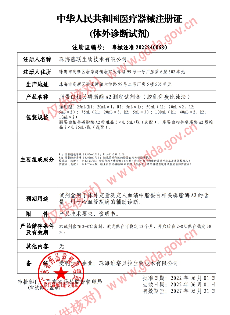魯械注準(zhǔn)20242401055/青島漢唐生物科技有限公司 有效期至:2029-12-01脂蛋白相關(guān)磷脂酶A2測(cè)定試劑盒(膠乳免疫比濁法)(首次注冊(cè))