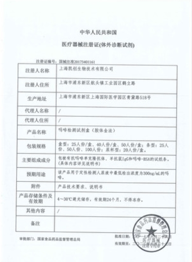 國械注準20193400047/廈門中生朗捷生物技術有限公司 有效期至:2024-01-16嗎啡檢測試劑盒(膠體金法)