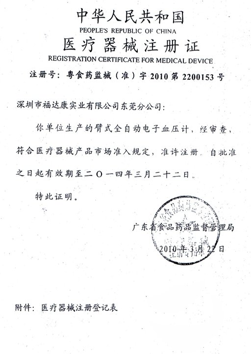 粵食藥監(jiān)械(準(zhǔn))字2010第2200153號(hào)