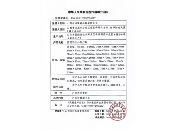 黔械注準20252090096/貴州楊百年藥業(yè)有限公司 有效期至:2030-06-10醫(yī)用遠紅外治療貼