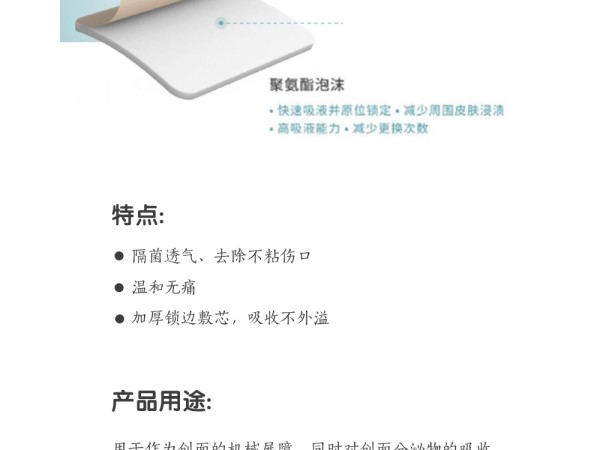 通過泡沫吸收層吸收并控制創(chuàng)面滲出液,用于滲出液較多的非慢性創(chuàng)面的覆蓋和護(hù)理。