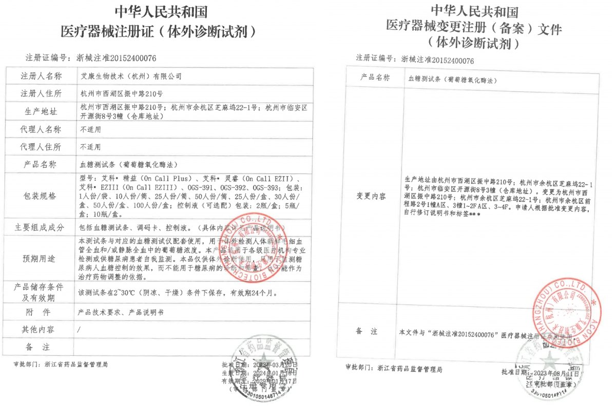 浙械注準(zhǔn)20152400213/艾康生物技術(shù)(杭州)有限公司 有效期至:2024-11-07血糖測(cè)試條(葡萄糖氧化酶法)