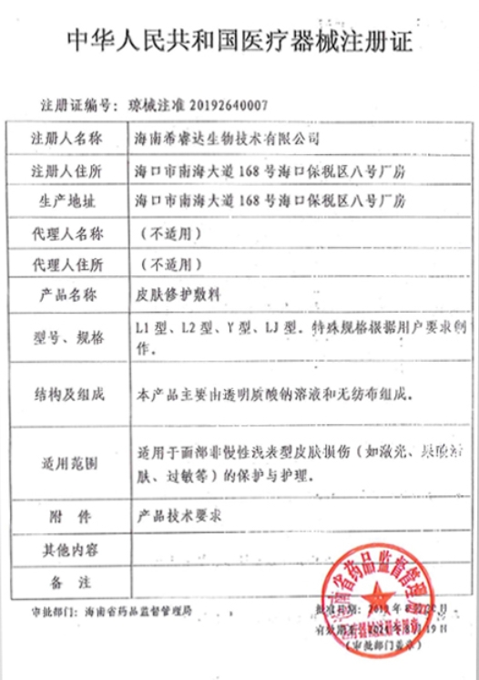 瓊械注準(zhǔn)20242140027/海南希睿達(dá)生物技術(shù)有限公司 有效期至:2029-08-19皮膚修護(hù)敷料