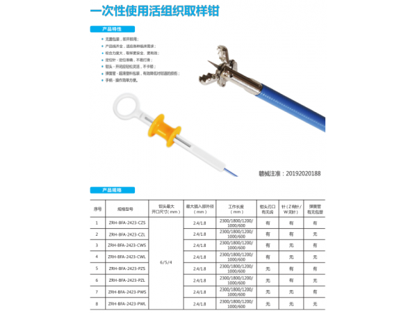 蘇械注準(zhǔn)20192020178/揚(yáng)州發(fā)特利醫(yī)療器械科技有限公司 有效期至:2029-02-25一次性使用活組織取樣鉗