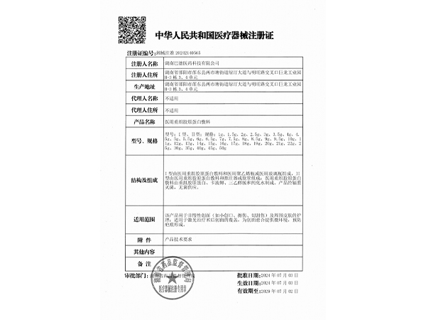 遼寧省醫(yī)用耗材限價掛網(wǎng)產(chǎn)品(2025年第五批)增補入庫 醫(yī)用重組膠原蛋白敷料 湘械注準20242140565 2.5g/支 698.0000