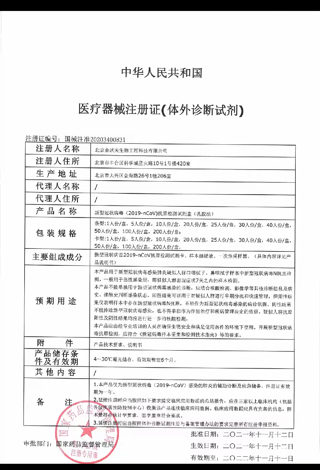2022-03-12 1、預期用途:由“本產(chǎn)品用于新型冠狀病毒感染肺炎疑似人群口咽拭子、鼻咽拭子樣本中新型冠狀病毒N抗原檢測。一般用于急性感染期,即疑似人群出現(xiàn)癥狀7天之內(nèi)的樣本檢測。本產(chǎn)品不能單獨用于新型冠狀病毒感染的診斷,應結合核酸檢測、影像學等其他診斷信息及病史、接觸史判斷感染狀態(tài)。陽性結果可以用于對疑似人群進行早期分流和快速管理,但陽性結果僅表明樣本中存在新型冠狀病毒N抗原,不能作為新型冠狀病毒感染的確診依據(jù)。陰性結果不能排除新型冠狀病毒感染,也不得單獨作為作出治療和疾病管理決定的依據(jù)。疑似人群抗原陽性及陰性結果均應進行進一步的核酸檢測。本產(chǎn)品應由經(jīng)專業(yè)培訓的人員在確保生物安全和滿足使用條件的環(huán)境下使用。開展新型冠狀病毒抗原檢測,應符合《新冠病毒樣本采集和檢測技術指南》等的要求?!弊兏鼮椤氨井a(chǎn)品用于定性檢測口咽拭子、鼻咽拭子和鼻拭子樣本中新型冠狀病毒(2019-nCoV)N抗原。適用人群參照《新冠病毒抗原檢測應用方案(試行)》等國家相關規(guī)定執(zhí)行。本產(chǎn)品不能單獨用于新型冠狀病毒感染的診斷,應結合核酸檢測、影像學等其他診斷信息及病史、接觸史判斷感染狀態(tài)。陽性結果可以用于對疑似人群進行早期分流和快速管理,但陽性結果僅表明樣本中存在新型冠狀病毒抗原,不能作為新型冠狀病毒感染的確診依據(jù)。陰性結果不能排除新型冠狀病毒感染,也不得單獨作為作出治療和疾病管理決定的依據(jù)。疑似人群抗原陽性及陰性結果均應進行進一步的核酸檢測。檢測陽性受試者應遵循當?shù)匾咔榉揽卣哌M行報告和隔離,并尋求相應的醫(yī)療幫助;檢測陰性受試者應嚴格遵守當?shù)匾咔榉揽匾?,必要時進一步采取其他更靈敏的檢測方法進行確認,若仍為陰性應持續(xù)進行監(jiān)測,并及時尋求醫(yī)療幫助。產(chǎn)品使用環(huán)境應遵循《新型冠狀病毒抗原檢測應用方案(試行)》等國家相關規(guī)定?!?、主要組成成分:增加“生物安全袋。(具體內(nèi)容詳見產(chǎn)品說明書)”3、產(chǎn)品說明書中內(nèi)容的更改,具體內(nèi)容見附件。請注冊人依據(jù)變更批件及附件自行修訂相關內(nèi)容。rn2022-03-15 “注冊人住所:北京市豐臺區(qū)科學城星火路10號1號樓420室”變更為“注冊人住所:北京市大興區(qū)中關村科技園區(qū)大興生物醫(yī)藥產(chǎn)業(yè)基地華佗路50號院23號樓一層101”。 rn2022-04-25 產(chǎn)品儲存條件和/或有效期的變更,具體內(nèi)容見附件。產(chǎn)品說明書變更,具體內(nèi)容見附件。 rn2022-11-10 說明書和產(chǎn)品技術要求變更,具體內(nèi)容詳見附件,請注冊人依據(jù)變更批件及其附件自行修訂產(chǎn)品說明書、技術要求中相關內(nèi)容。 rn2022-12-13 “生產(chǎn)地址:北京市大興區(qū)金苑路26號1幢206室”變更為“生產(chǎn)地址:北京市大興區(qū)金苑路26號1幢206室 北京市大興區(qū)金苑路26號1號樓A、B、C座5層”。 rn2023-02-22 注冊人住所由北京市大興區(qū)中關村科技園區(qū)大興生物醫(yī)藥產(chǎn)業(yè)基地華佗路50號院23號樓一層101;變更注冊證載明的生產(chǎn)地址由北京市大興區(qū)金苑路 26 號 1 幢 206 室,北京市大興區(qū)金苑路 26 號 1 號樓 A、B、C 座 5 層;注冊人住所變更為:北京市大興區(qū)經(jīng)濟開發(fā)區(qū)科苑路18號3幢二層R2215室;生產(chǎn)地址變更為:北京市大興區(qū)金苑路 26 號 1 幢 206 室,北京市大興區(qū)金苑路 26 號 1 號樓 A、B、C 座 5 層,北京市大興區(qū)華佗路 50 號院 23 號樓 1 層 102-103 室、2 層、3 層、4 層