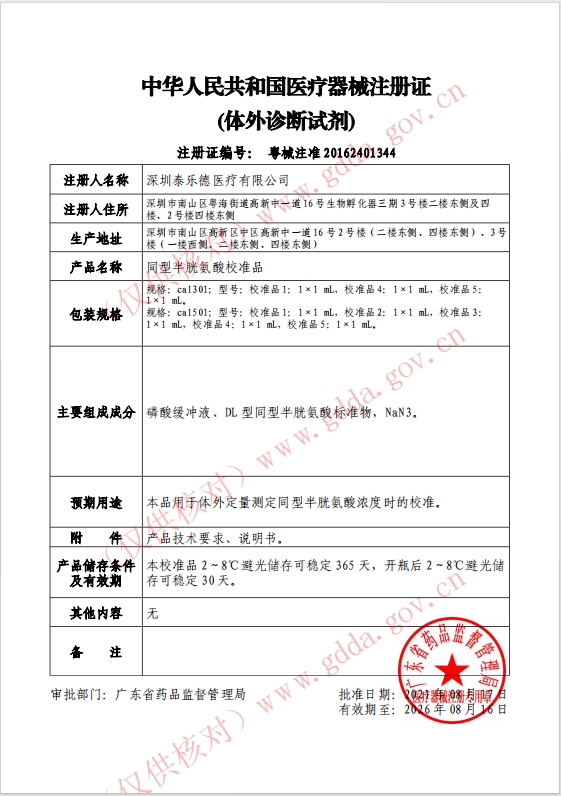 2022-08-08: 1、主要組成成分由“磷酸緩沖液、DL型同型半胱氨酸標(biāo)準(zhǔn)物、NaN3。”變更為“生理鹽水、DL型同型半胱氨酸標(biāo)準(zhǔn)物、防腐劑。”。rn2、注冊證附件“產(chǎn)品技術(shù)要求”變更內(nèi)容見附頁1(共 12頁)。rn3、注冊證附件“產(chǎn)品說明書”變更內(nèi)容見附頁2(共2頁)。